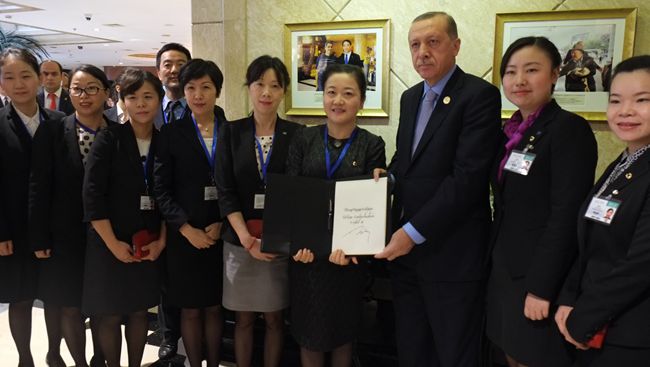 9月5日下午,土耳其總統(tǒng)埃爾多安離開酒店前,對(duì)杭州維景的服務(wù)深表滿意,在眾多媒體的關(guān)注下,為杭州維景簽名留念,并與管理人員合影,感謝杭州維景提供的溫馨、細(xì)致、周到的服務(wù),同時(shí)盛情邀請(qǐng)酒店員工去土耳其觀光游覽。