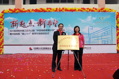 2010年10月11日上午,位于四川省資陽(yáng)市雁江區(qū)丹山鎮(zhèn)牌坊村的中國(guó)免稅希望小學(xué)里喜氣洋洋、熱鬧非凡。特意從北京趕來(lái)的中國(guó)青少年發(fā)展基金會(huì)的汪敏副秘書(shū)長(zhǎng)、馮敏慧部長(zhǎng),中免集團(tuán)盧路總裁和四川省市兩地的領(lǐng)導(dǎo)與全校近兩百名師生一起為新落成的“資陽(yáng)市雁江區(qū)丹山鎮(zhèn)中國(guó)免稅希望小學(xué)”舉行了隆重的落成典禮。