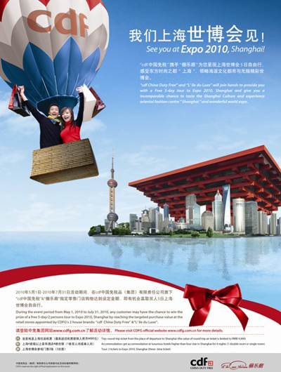 中免集團利用2010年上海世博會所帶來的商機,聯(lián)合集團下屬零售門店及品牌供應(yīng)商進行了以“購物精彩世博游”為主題的聯(lián)合促銷活動。活動歷時4個月,從2010年5月1日開始,并于2010年8月31日精彩落幕。