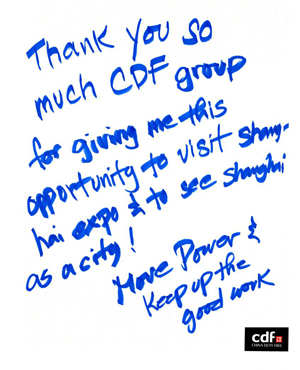 “我家是在菲律賓,每年都會來一次廈門,每次都在免稅店買些東西。這次從廈門機場準(zhǔn)備返程的時候在免稅店買兩瓶酒還有施華洛世奇飾品準(zhǔn)備送我太太,結(jié)賬的時候店員介紹我填寫抽獎卡片,說有機會可以中獎免費游世博會,沒想到真的中獎了。當(dāng)接到中獎通知電話的時候感覺很是不可思議,很懷疑‘是真的嗎?’但是當(dāng)中獎資料文件和世博門票郵寄給我的時候我才相信這是真的呵呵。”