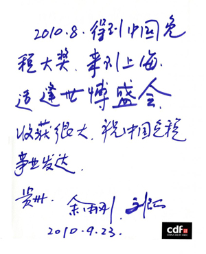 “接到中獎通知電話的時候有些以外了,有些不敢相信,不過在聽到工作人員的詳細介紹后就覺得很開心自己能夠獲得特等獎,隨后又收到了貴公司寄給我的獲獎通知及合同還有世博會門票,就覺得做的很細致,也完全相信了我確實是這么幸運了,非常高興。”