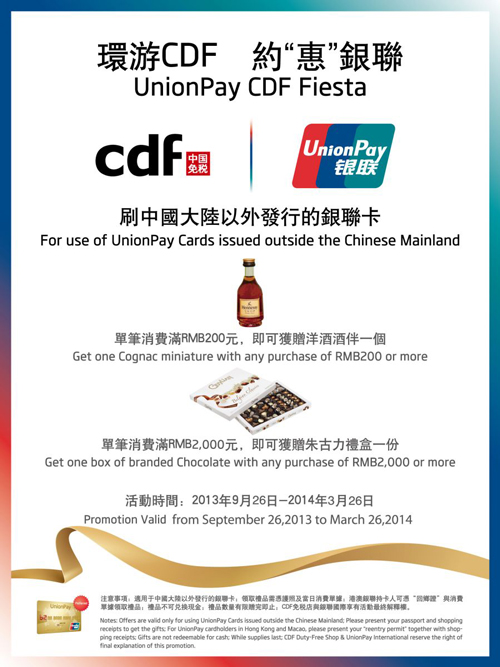 刷中國大陸以外發(fā)行的銀聯(lián)卡,單筆消費(fèi)滿200元,即可獲贈(zèng)品牌洋酒酒伴一個(gè);單筆消費(fèi)滿2000元,即可獲贈(zèng)品牌巧克力禮盒一份。