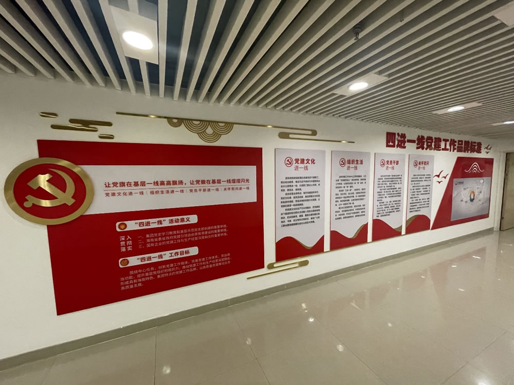 該長(zhǎng)廊全長(zhǎng)近125米,分為“初心使命”“奮輯前行”“黨建領(lǐng)航”“踐行承諾”四個(gè)篇章,涵蓋了習(xí)總書(shū)記重要講話(huà)精神摘錄、企業(yè)發(fā)展歷程、歷史成績(jī)、黨組織概況及組織架構(gòu)、“我為群眾辦實(shí)事”實(shí)踐活動(dòng)開(kāi)展情況、精準(zhǔn)扶貧、黨風(fēng)廉政建設(shè)、防范走私套代購(gòu)專(zhuān)項(xiàng)工作、黨建品牌創(chuàng)建要點(diǎn)、支部特色工作法、“兩優(yōu)一先”榮譽(yù)展示、黨建活動(dòng)剪影、黨務(wù)公開(kāi)欄、集團(tuán)黨建示范經(jīng)驗(yàn)推廣展示等十多個(gè)大類(lèi)的內(nèi)容,采用了傳統(tǒng)圖文并茂與視聽(tīng)互動(dòng)相結(jié)合的形式,專(zhuān)門(mén)設(shè)置了3處電子顯示屏,循環(huán)播放各類(lèi)影像素材,全景展現(xiàn)了三亞店多年來(lái)堅(jiān)持“聽(tīng)黨話(huà)、跟黨走”不動(dòng)搖的責(zé)任擔(dān)當(dāng)和廣大黨員干部員工不怕困難、勇于創(chuàng)新的奮斗精神。
