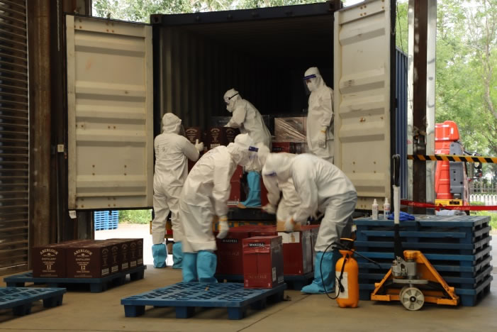 近日,又一批海運集裝箱抵達(dá)物流基地。首都機場聯(lián)合黨支部成立的黨員先鋒隊配合執(zhí)行消殺卸貨工作。大家先對集裝箱進行徹底無死角的全面消殺,隨后將貨物分批搬運、拆箱,對貨物單個最小包裝物進行逐一消殺,最后再統(tǒng)一裝箱。歷時5個小時,將全部貨物消殺完畢,為后續(xù)工作建立了第一道安全保障。